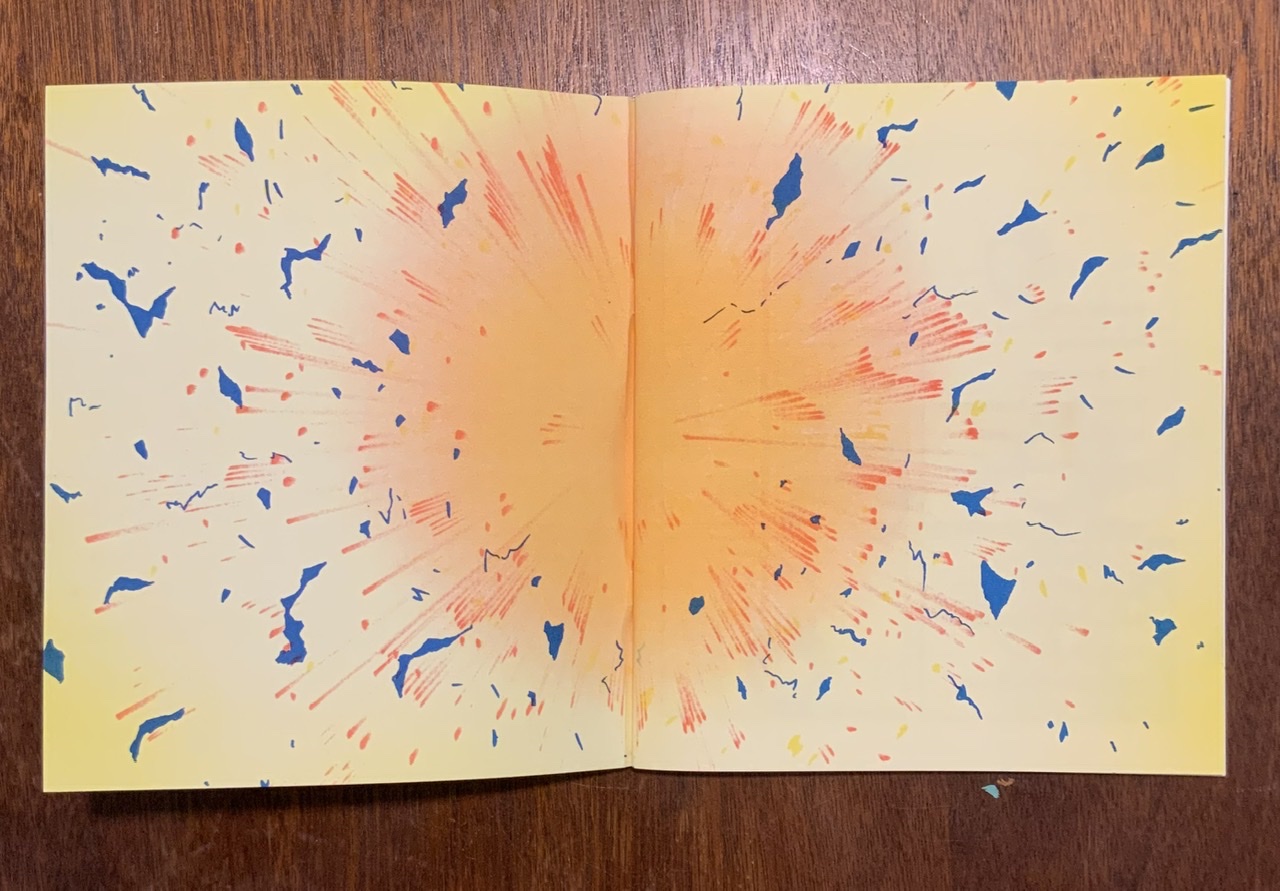 52 pages. Riso printed on 80lb cream white Mohawk Via Vellum.Interior pages printed in blue with 3 color endpapers.
